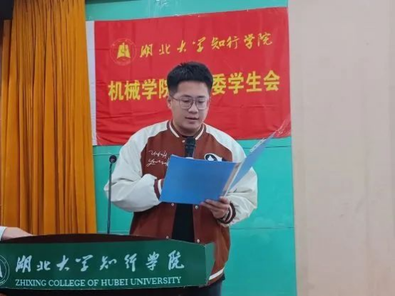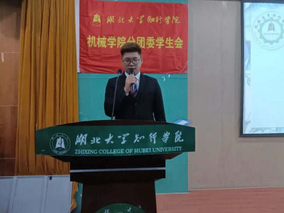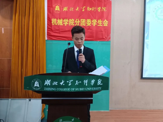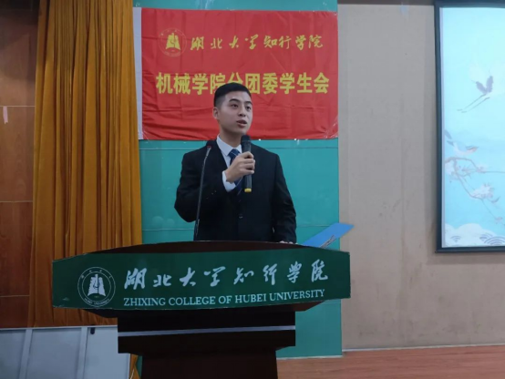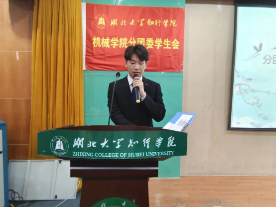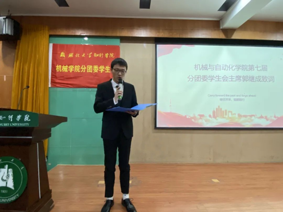 随后机械与自动化学院第七届分团委学生会主席郭继成发表致辞。他对上一年的工作进行了概括与总结,他希望新一届分团委学生会能做得更好,同时向干事们发出号召——争做实事,服务同学。