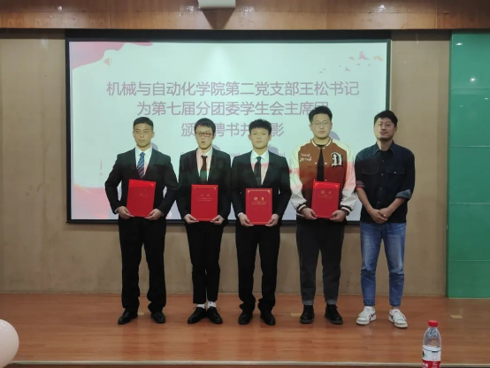 机械与自动化学院第二党支部王松书记为第七届分团委学生会主席团颁发聘书并合影。